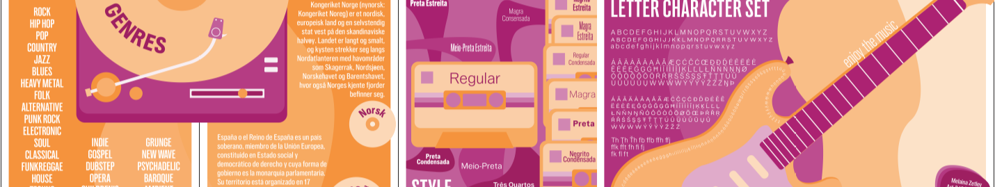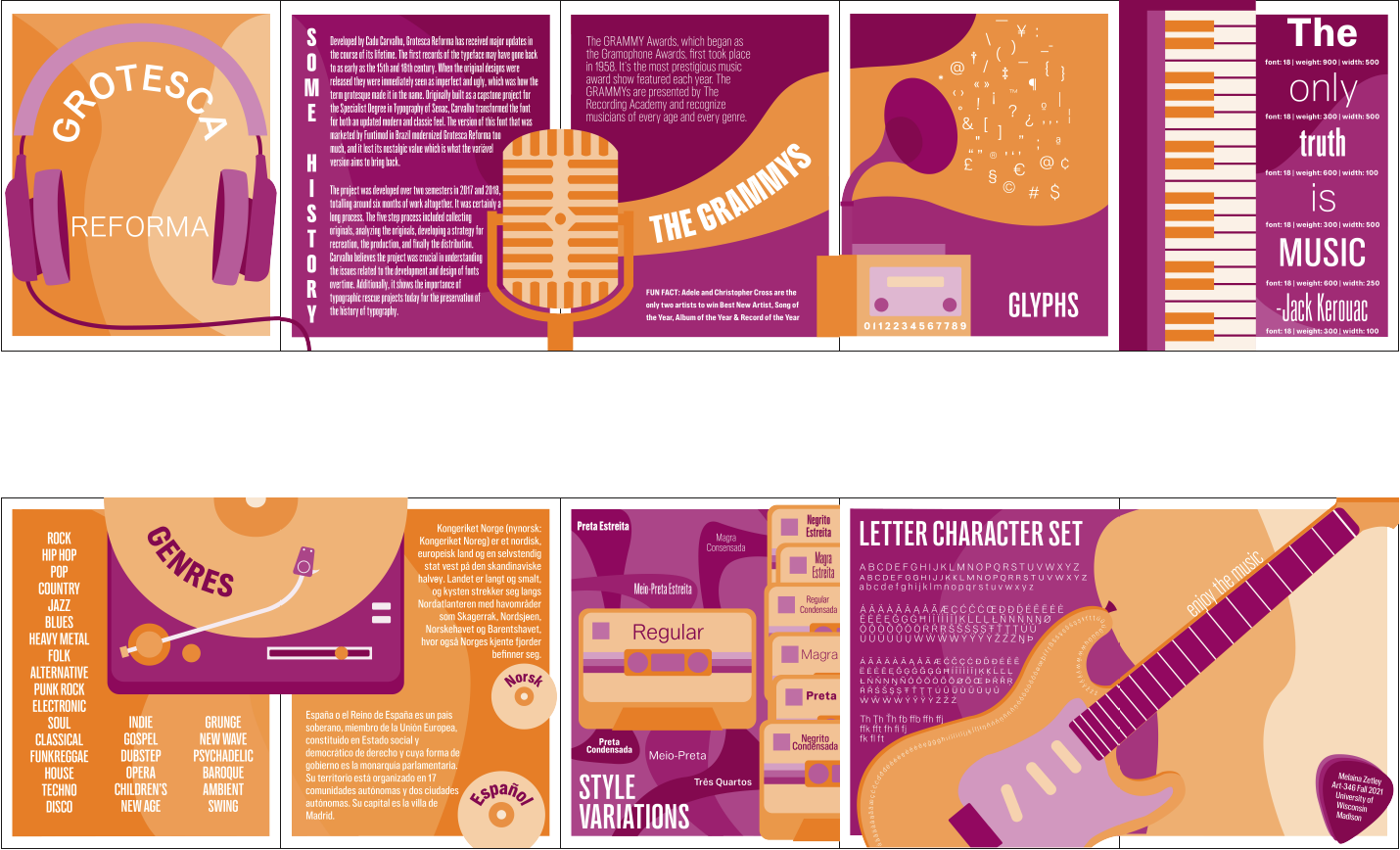 Designed for an art class at the University of Wisconsin-Madison. This is a 10-page layout that highlights the typeface Grotesca Reforma using the theme of music.