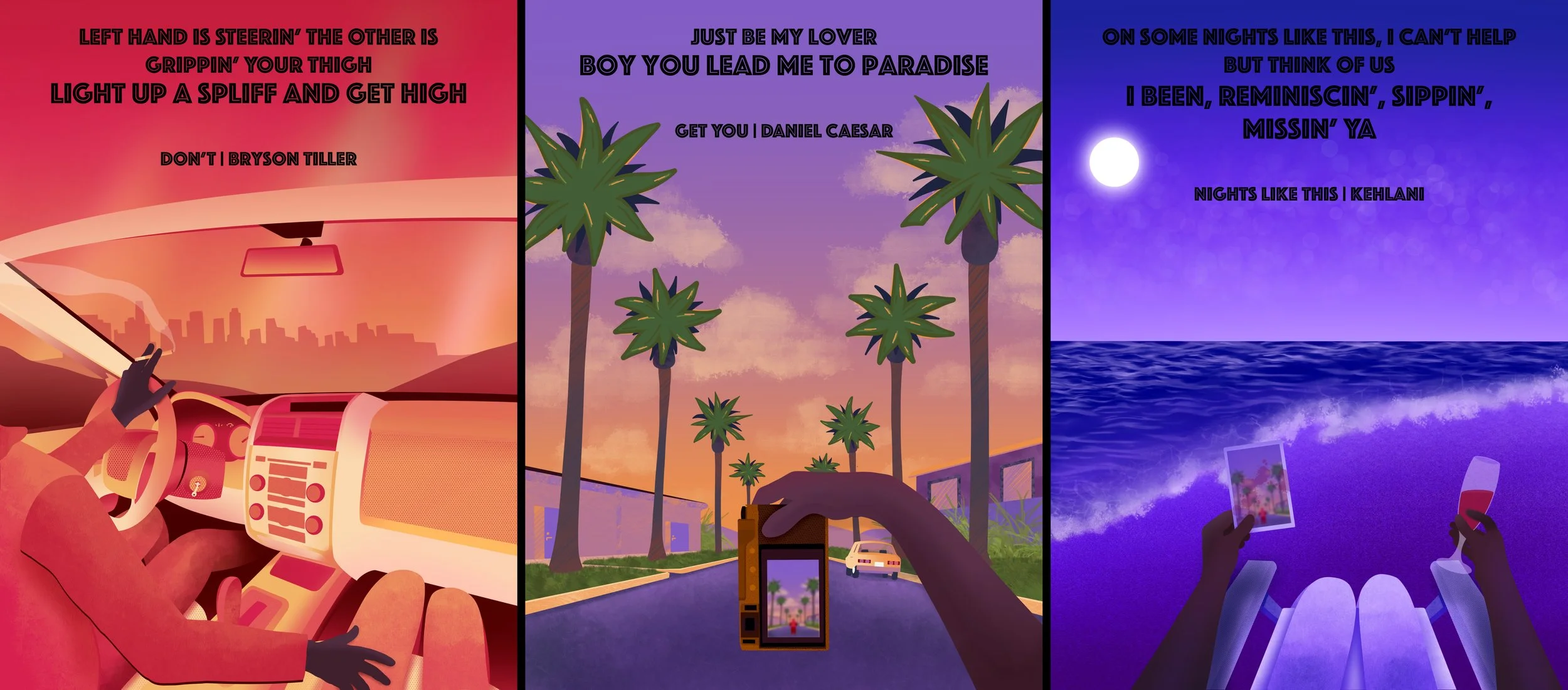 Designed for a poster design class at the University of Wisconsin-Madison. Using the state of California as an inspiration for the series, this is a collection of illustrations based on some of my favorite RnB songs.